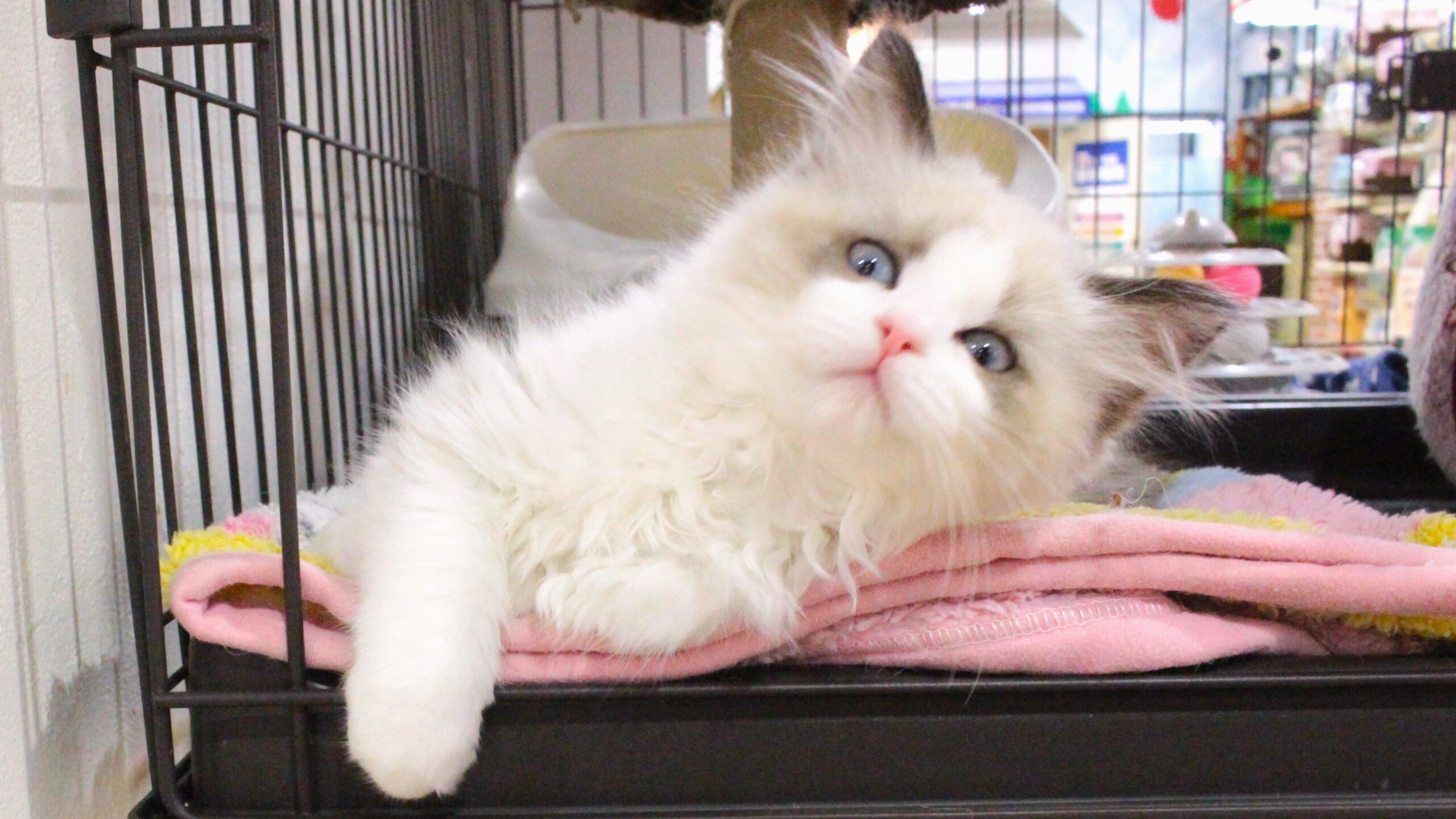 寝るのも遊ぶのも大好きなラグドールの女の子です!かわいい寝顔を撮ろうとしたけど…バッチリのカメラ目線!寝起きでもこの写真うつりのよさ。何をしててもぜ~んぶかわいいラグドールちゃんに、ぜひ会いに来てください~!