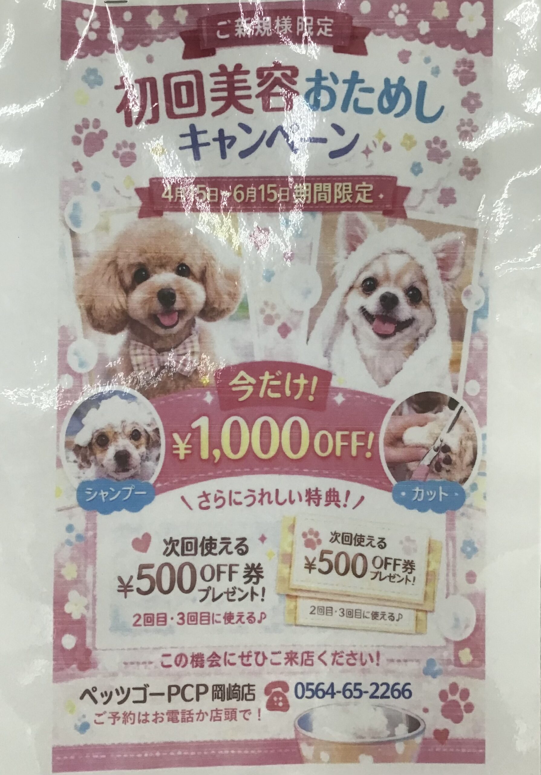 当店以外でワンちゃんを迎えられた方で、当店のトリミングを初めてご利用の方は期間中ご利用代金から¥1,000OFF!!