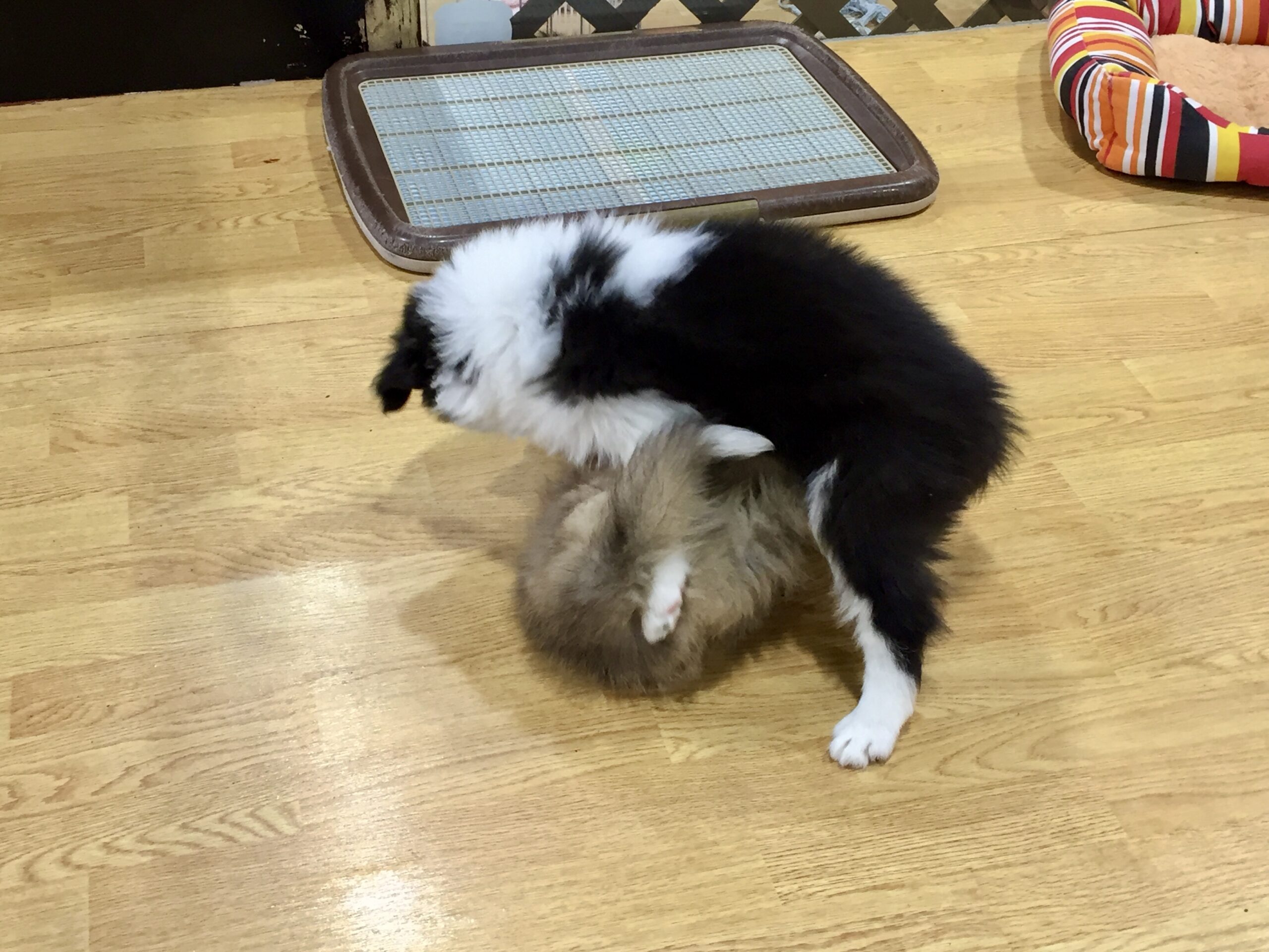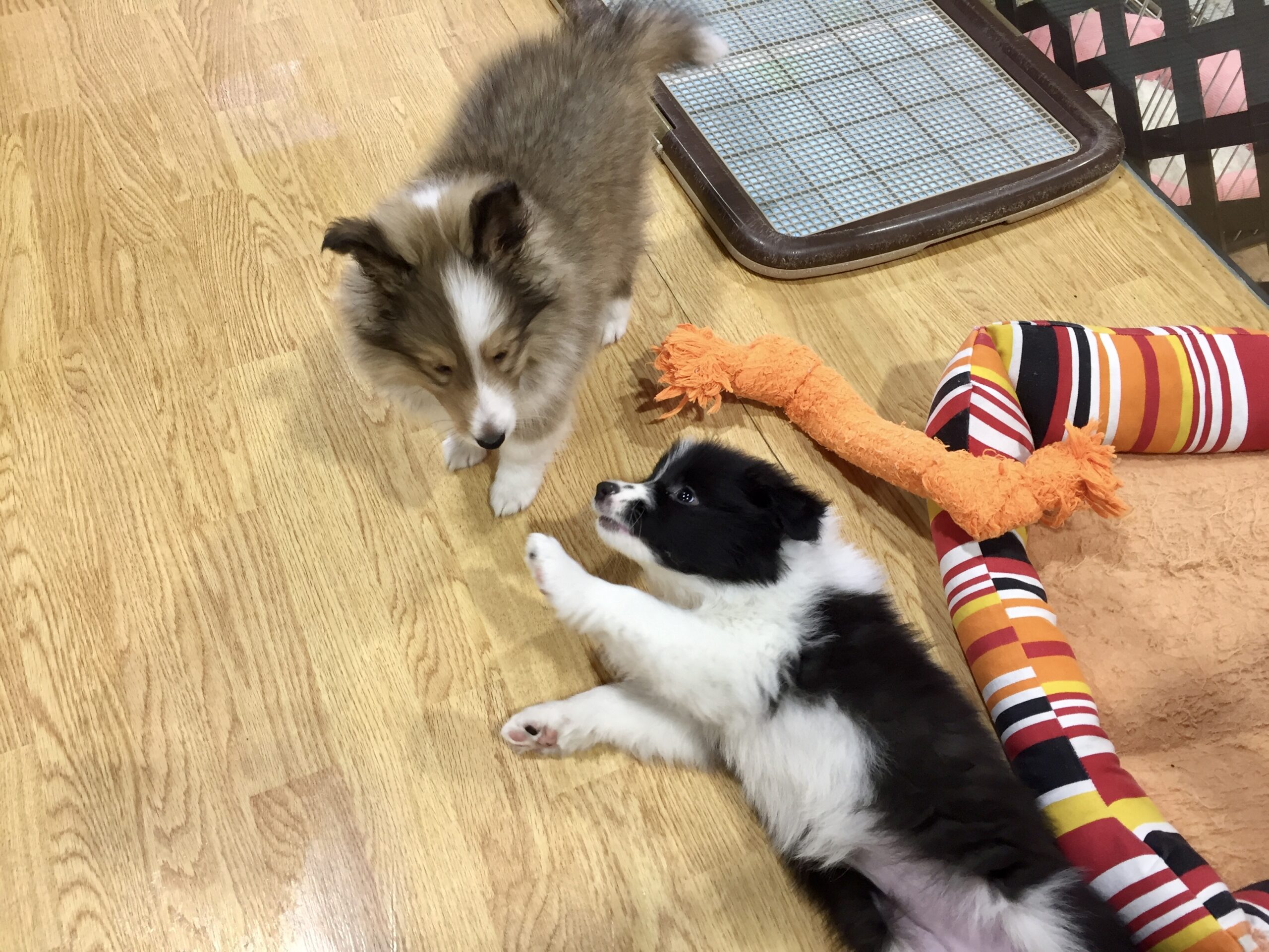 シェルティくんの方が先輩なのでボーダーちゃんがよくひっくり返って遊んでいますがたまに逆転していることも♪
