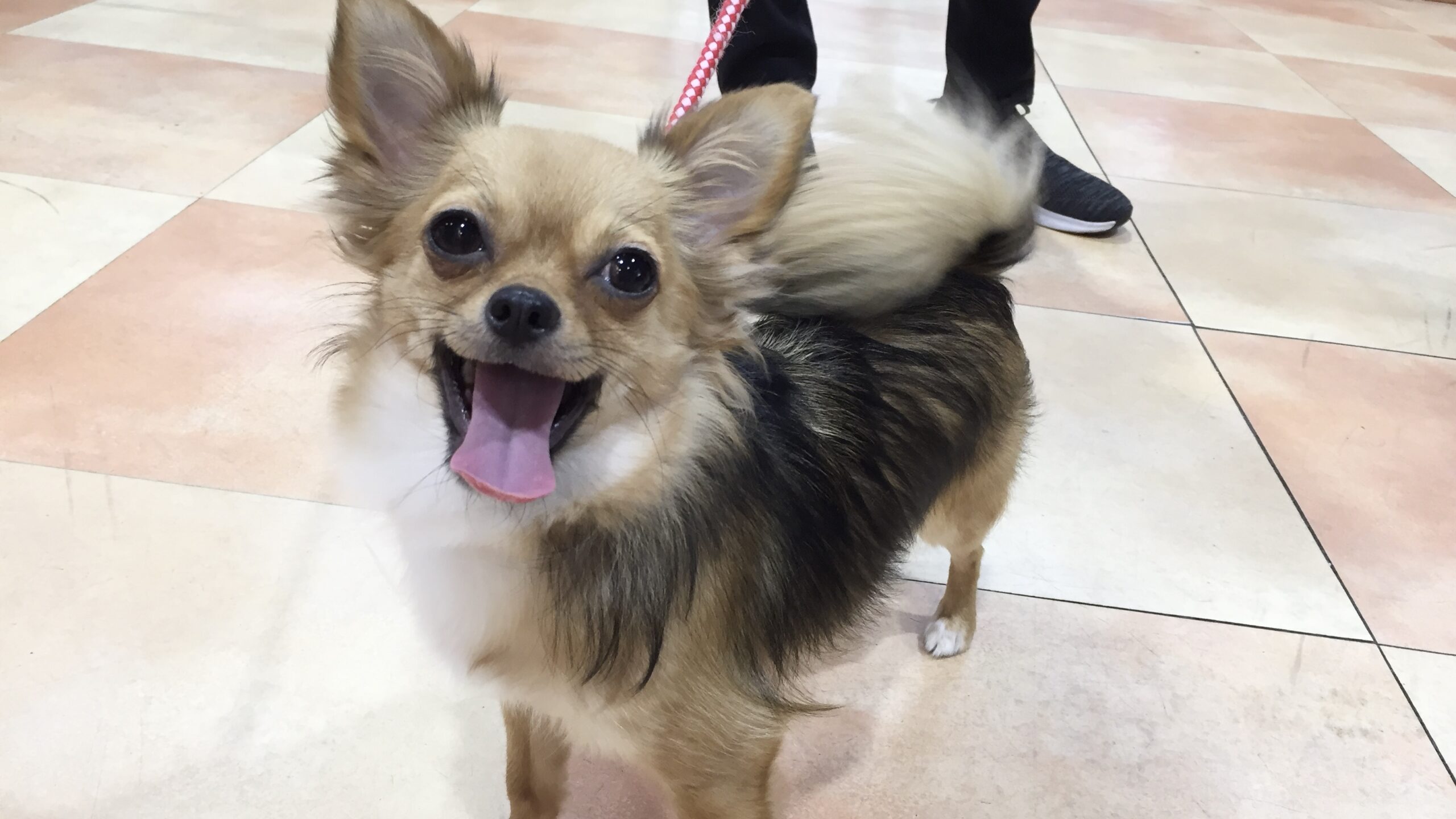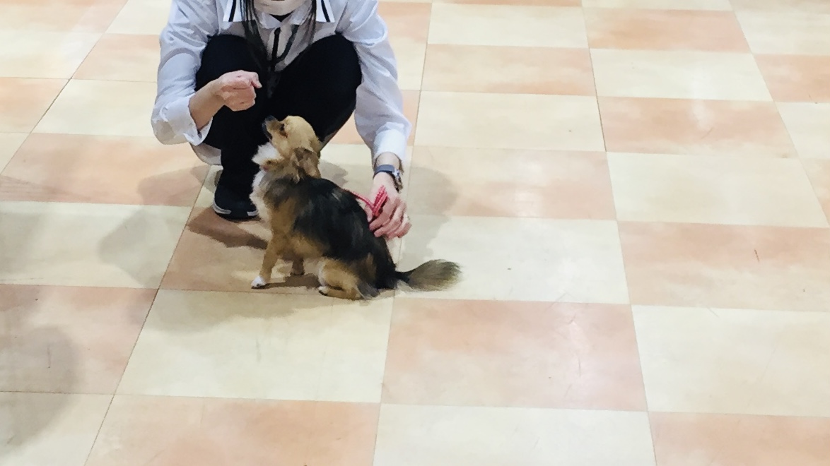 社会化トレーニング中の1才チワワちゃん。リードをつけてみんなにご挨拶!