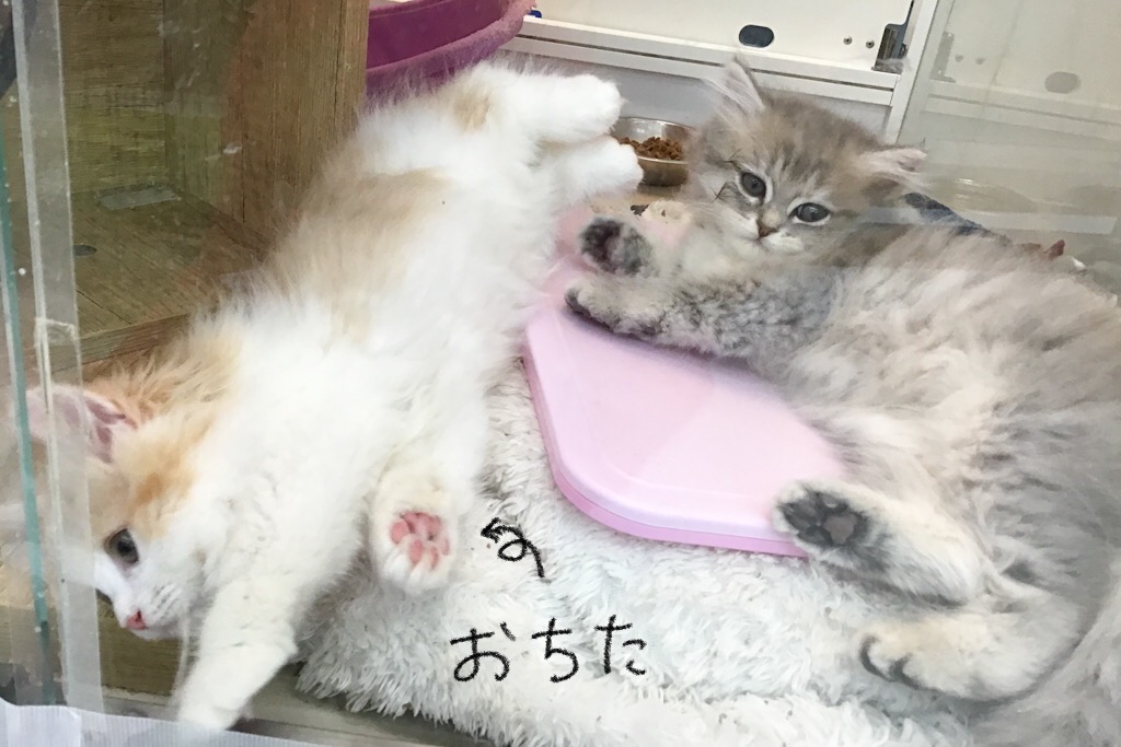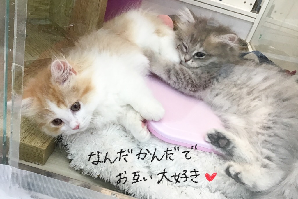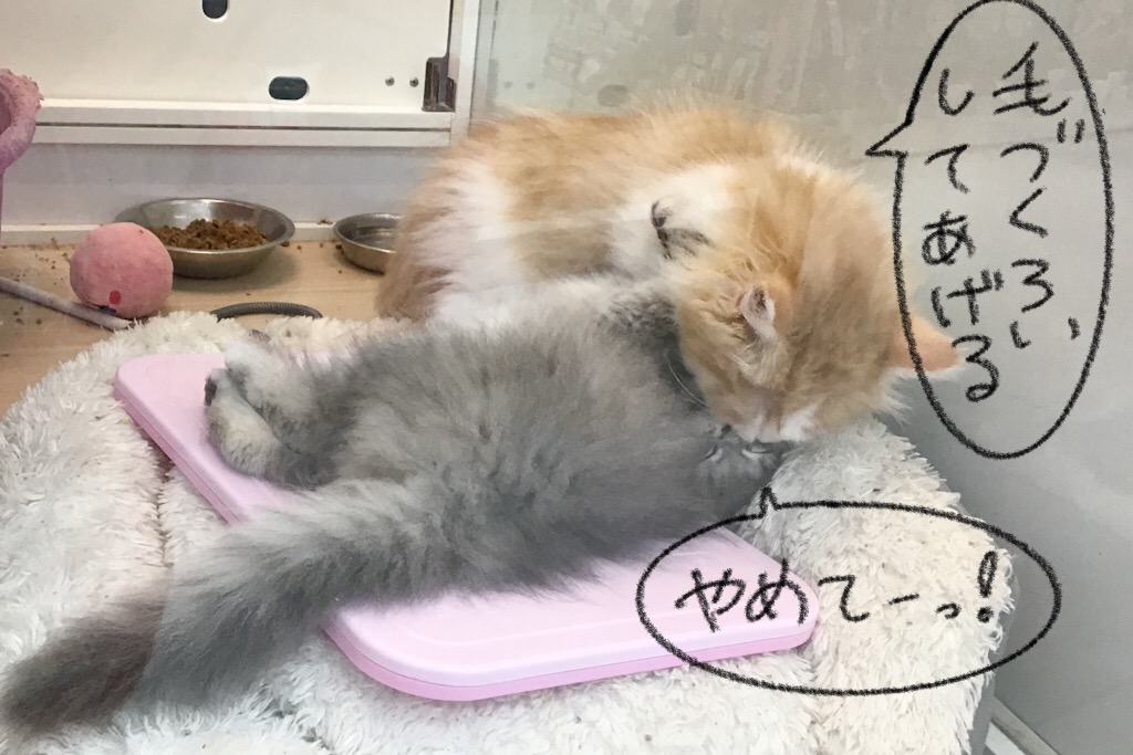 レッドタビーの男の子の方が少しだけお兄さんなので、ブルーパッチドタビーの女の子のお世話をしたいみたい(*^^)