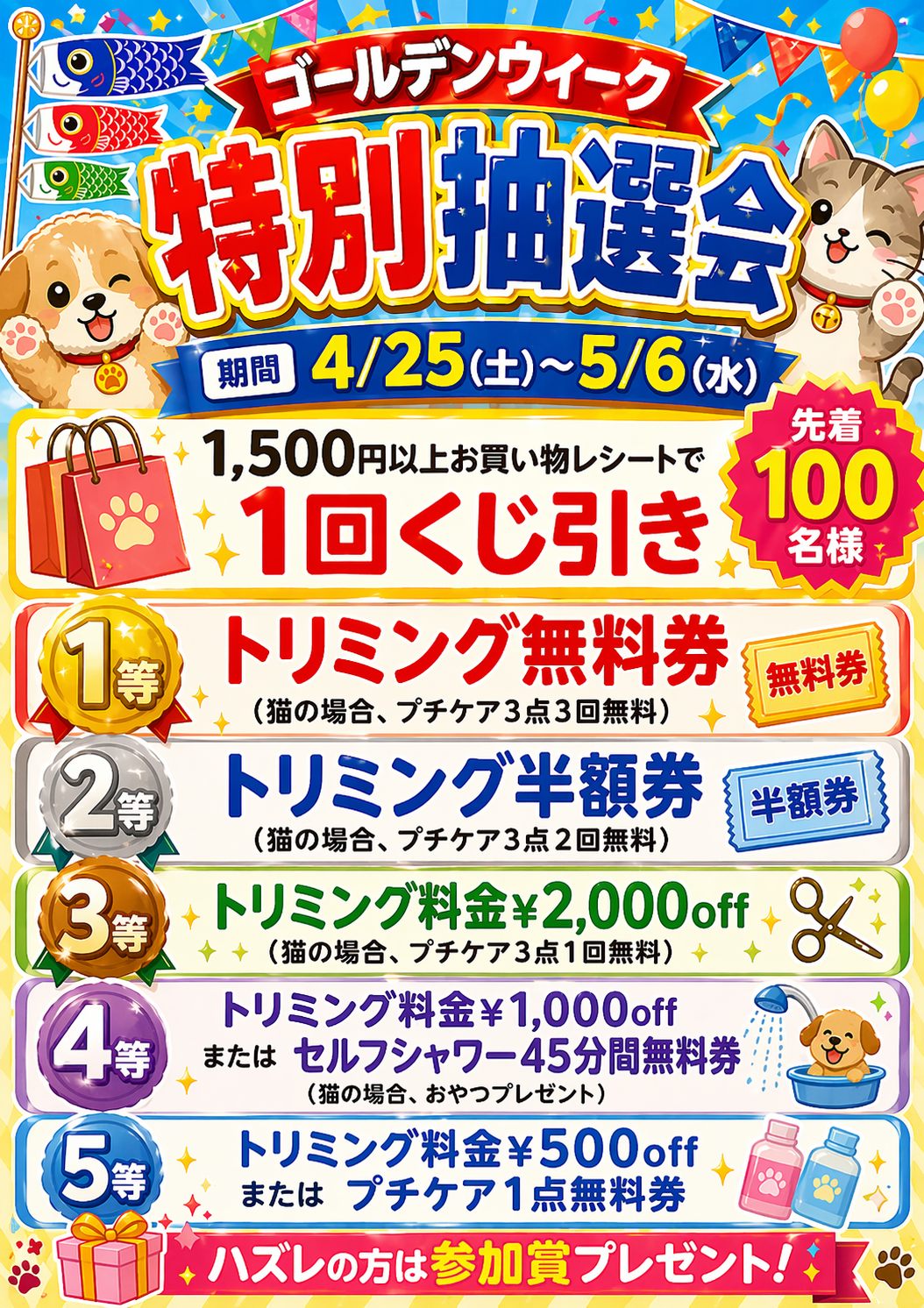 当店で行なっているトリミングやプチケア、セルフシャワーの割引券が当たるくじ引きとなっています!
